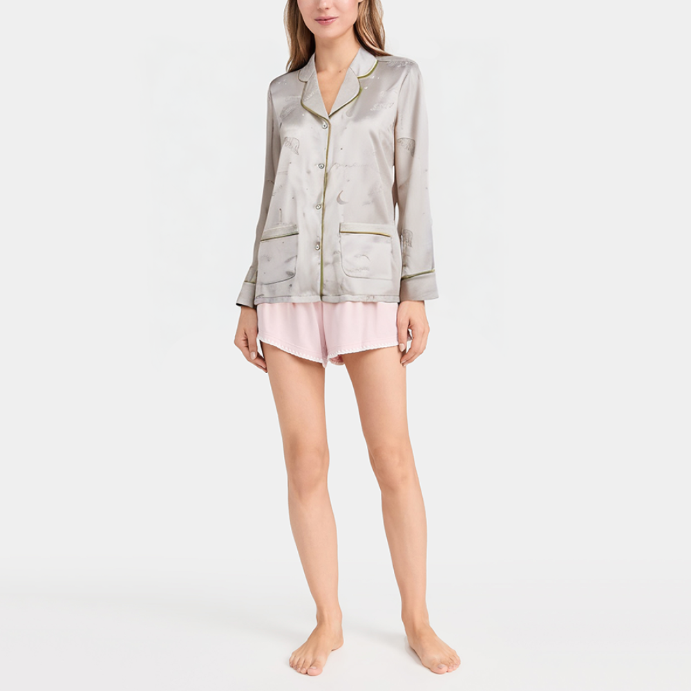 This women's nightgown features contrasting trim, adding a modern and stylish touch. Its classic lapel and long sleeves provide comfort, warmth, and breathability, perfect for spring and autumn, or for relaxing indoors. The single-breasted button placket allows for easy on and off, creating a clean, streamlined look. The side pockets are both practical and decorative, providing storage for small items and adding a touch of detail. The overall fit is snug but not constricting, and the natural fall provides a relaxed and comfortable feel, perfect for lounging around the house or sleeping comfortably.