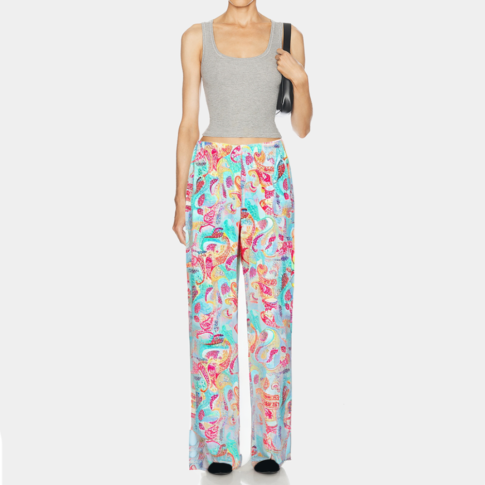 These long pajama pants feature a stylish print, creating a relaxed and elegant lounge style. The elastic waistband and decorative bow design provide a comfortable fit and add a touch of refined detail. The practical and convenient side pockets keep small essentials close at hand, enhancing everyday convenience. The straight-leg silhouette offers a smooth, natural drape and a relaxed, comfortable fit, perfect for lounging around the house or sleeping. The lightweight, breathable fabric feels soft and comfortable against the skin, keeping you dry and comfortable while you rest, combining practicality with style.