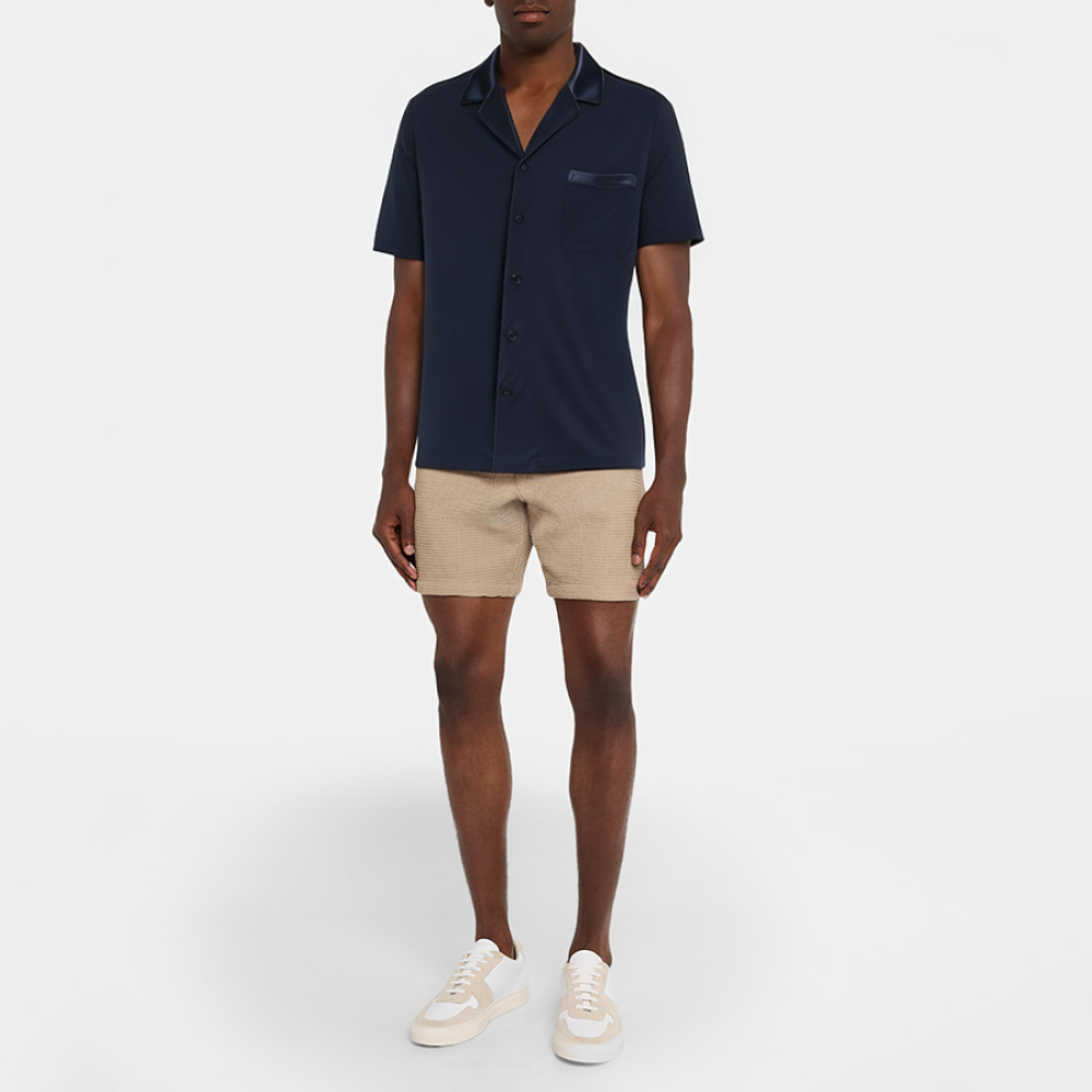 These men's pajamas feature a simple, solid color scheme with a lapel collar and short sleeves, creating a classic yet comfortable look. The single-breasted front buttoning makes them easy to put on and take off, adding a touch of sophistication. The chest pockets are practical yet stylish, easily storing small essentials. The loose fit provides ample room for movement, allowing for unrestricted comfort while sleeping. The fabric is soft, smooth, and breathable, making it suitable for all seasons.