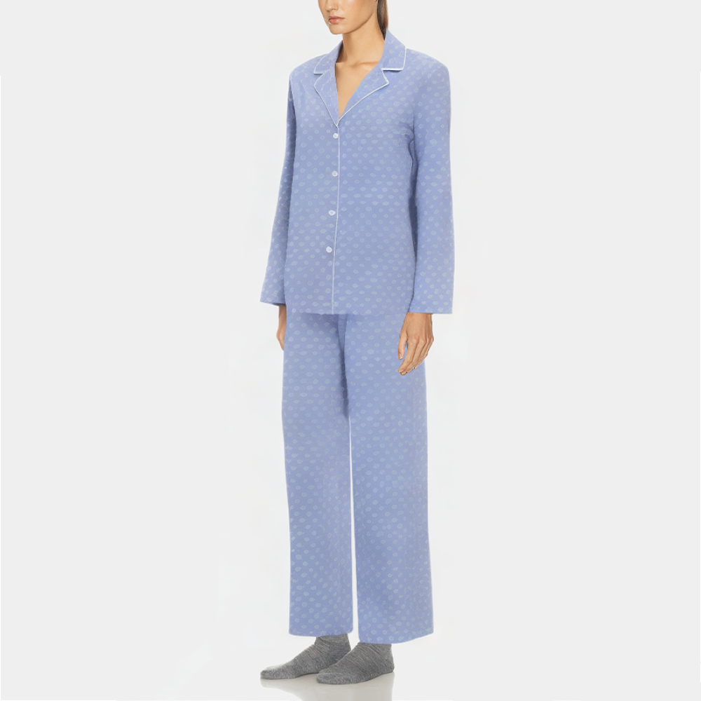 This women's pajama set, highlighted by a stylish print, showcases a relaxed yet comfortable lifestyle. The top features a lapel and single-breasted design for a classic, effortless look. The long sleeves are tailored for a comfortable, all-season fit and offer a gentle, hugging feel. The straight-leg bottoms feature an elastic waist with a drawstring tie for an adjustable fit and exceptional comfort. The side pockets combine practicality with style, making it convenient for lounging around the house. The overall design is simple and elegant, making it an ideal choice for everyday living, lounging, and sleeping.