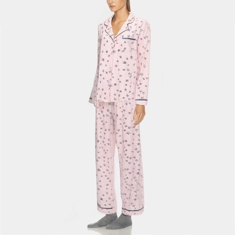 This women's pajama set features a star print, adding a playful and romantic touch. The top features a classic lapel and single-breasted design with chest pockets, creating a simple yet refined look. The long sleeves are comfortable and relaxed, perfect for everyday wear. The bottoms feature an elastic waist and drawstring ties for an adjustable fit. The practical side pockets and the straight-leg silhouette drape naturally, providing a lightweight and breathable feel for a soft and comfortable fit, making it an ideal choice for lounging at home or sleeping.