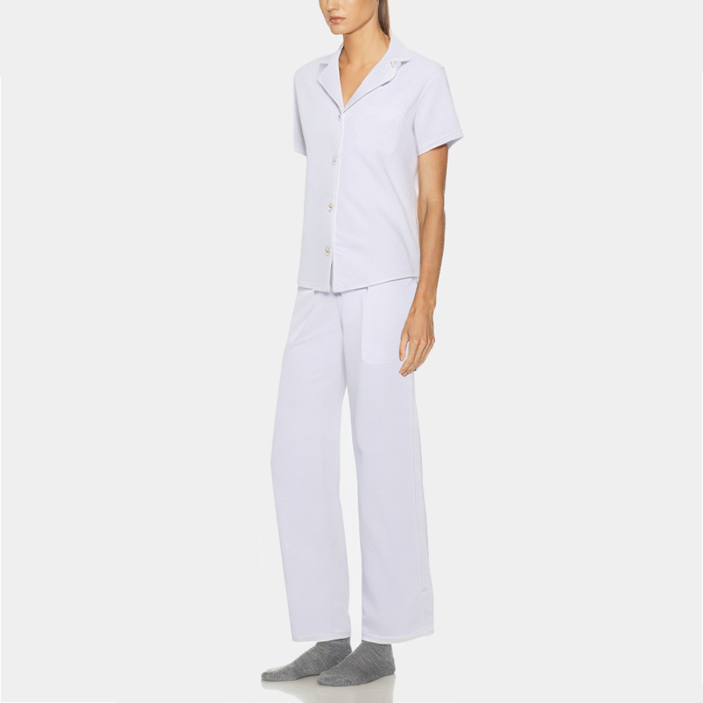 This women's pajama set features a floral print, creating a fresh and elegant homey look. The top features a lapel, short sleeves, and a single-breasted button fastening for easy on and off, while the chest pocket adds a practical and detailed touch. The bottoms are straight-leg pants with an elastic waistband for a comfortable fit and side pockets for added practicality. The loose fit makes it lightweight and breathable, perfect for lounging around the house or sleeping.