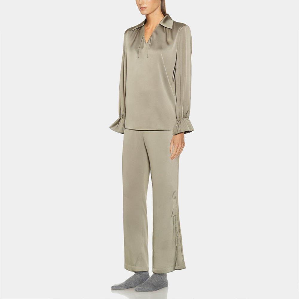 This women's pajama set is crafted from a solid satin fabric with a smooth, soft feel for a silky, comfortable fit. The top features a classic lapel and long sleeves with elastic cuffs for added mobility and refinement. Decorative ties add a finishing touch. The bottoms are straight-leg with an elastic waistband for easy on and off, while ensuring a comfortable fit. The practical side pockets combine style with functionality, and the loose fit makes it an ideal set for both lounging and sleeping.