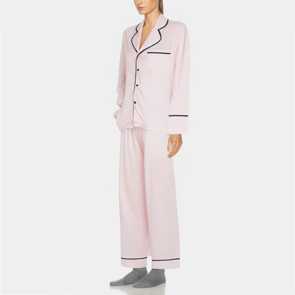 This women's pajama set combines comfort and style, perfect for lounging at home. The top features a classic lapel design and a single-breasted button placket for easy on and off, while chest pockets and contrasting trim add a unique touch. The long sleeves provide moderate coverage while remaining comfortable and breathable, making it perfect for all seasons. The bottoms have a straight-leg silhouette and an elastic waistband that fits your waistline and provides flexibility. The side pockets are practical and convenient for storing small items.