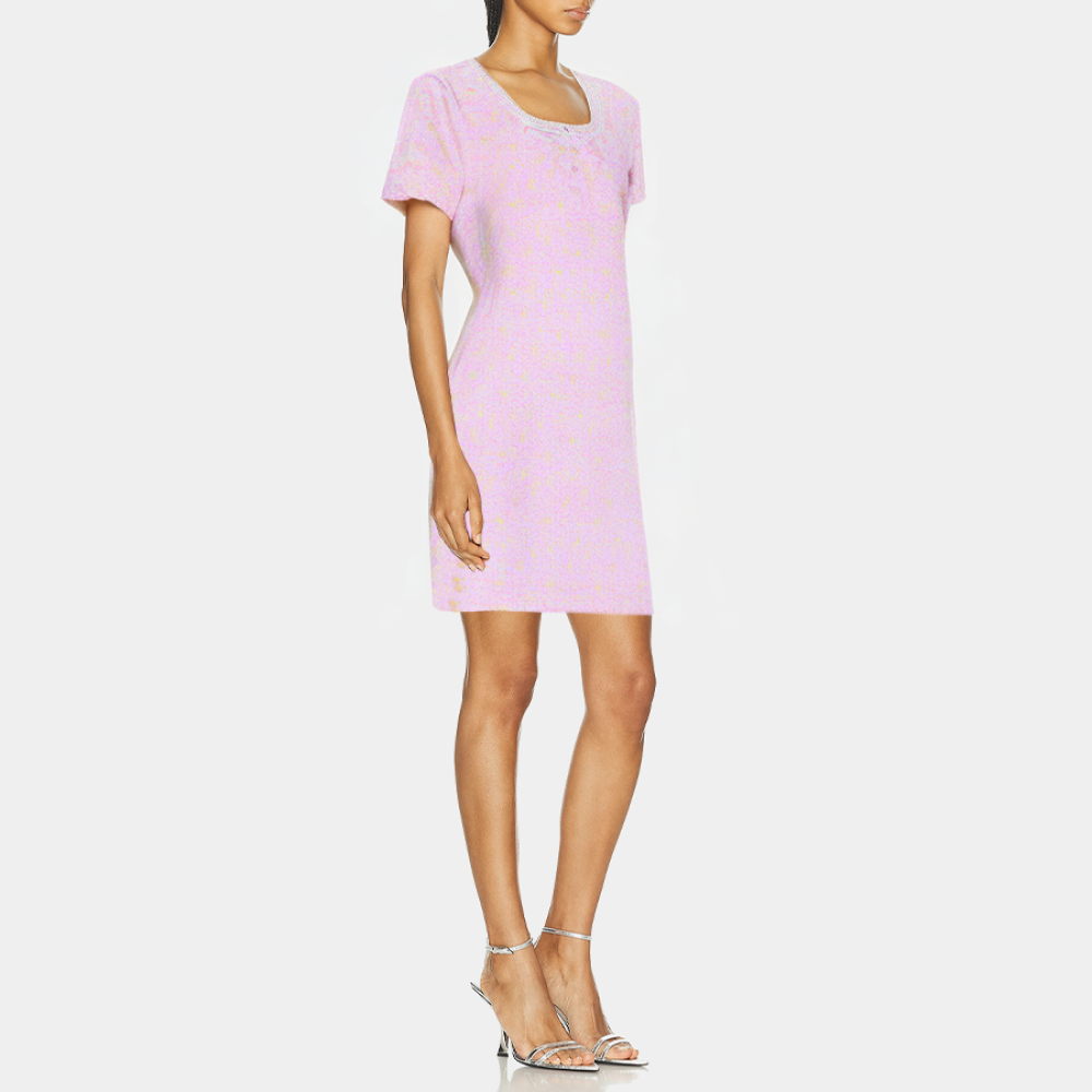 This women's nightgown features a fresh floral print, showcasing a sweet and elegant style. The U-neckline is flattering, while the short sleeves are comfortable and breathable, perfect for warmer weather. The four-button front placket allows for easy on and off, adding a touch of refined detail. Lace detailing at the shoulders and neckline adds a feminine touch, layering the look and creating a romantic feel. The straight-cut design offers a relaxed, comfortable fit, allowing for ample room for movement while sleeping. The fabric is soft and breathable, providing both comfort and breathability.
