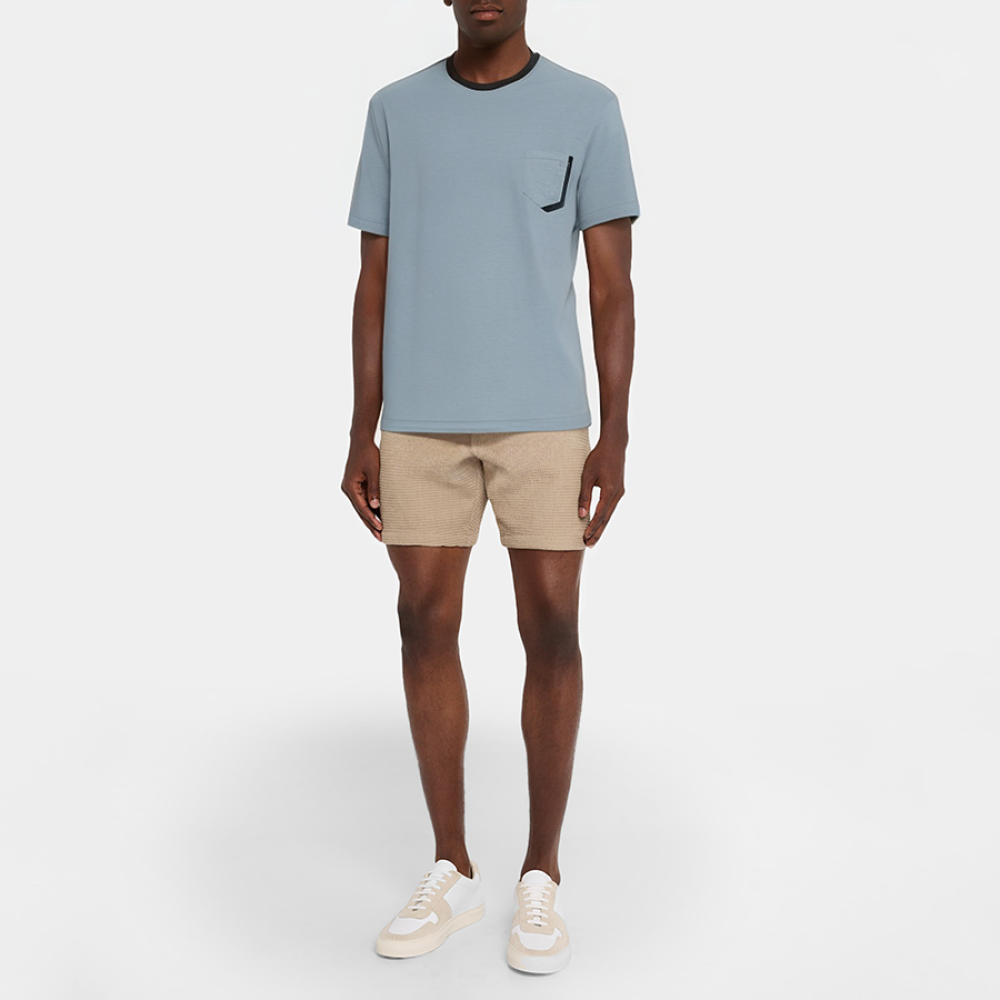 These men's pajamas feature contrasting trim, a round neckline, and short sleeves for a simple yet stylish look. The chest pocket adds practicality and detail, while the straight hem creates a clean, streamlined fit. The overall cut is regular, neither too tight nor too loose, providing a comfortable fit. The soft, slightly stretchy fabric ensures excellent breathability and comfort, making it perfect for lounging around the house or sleeping.