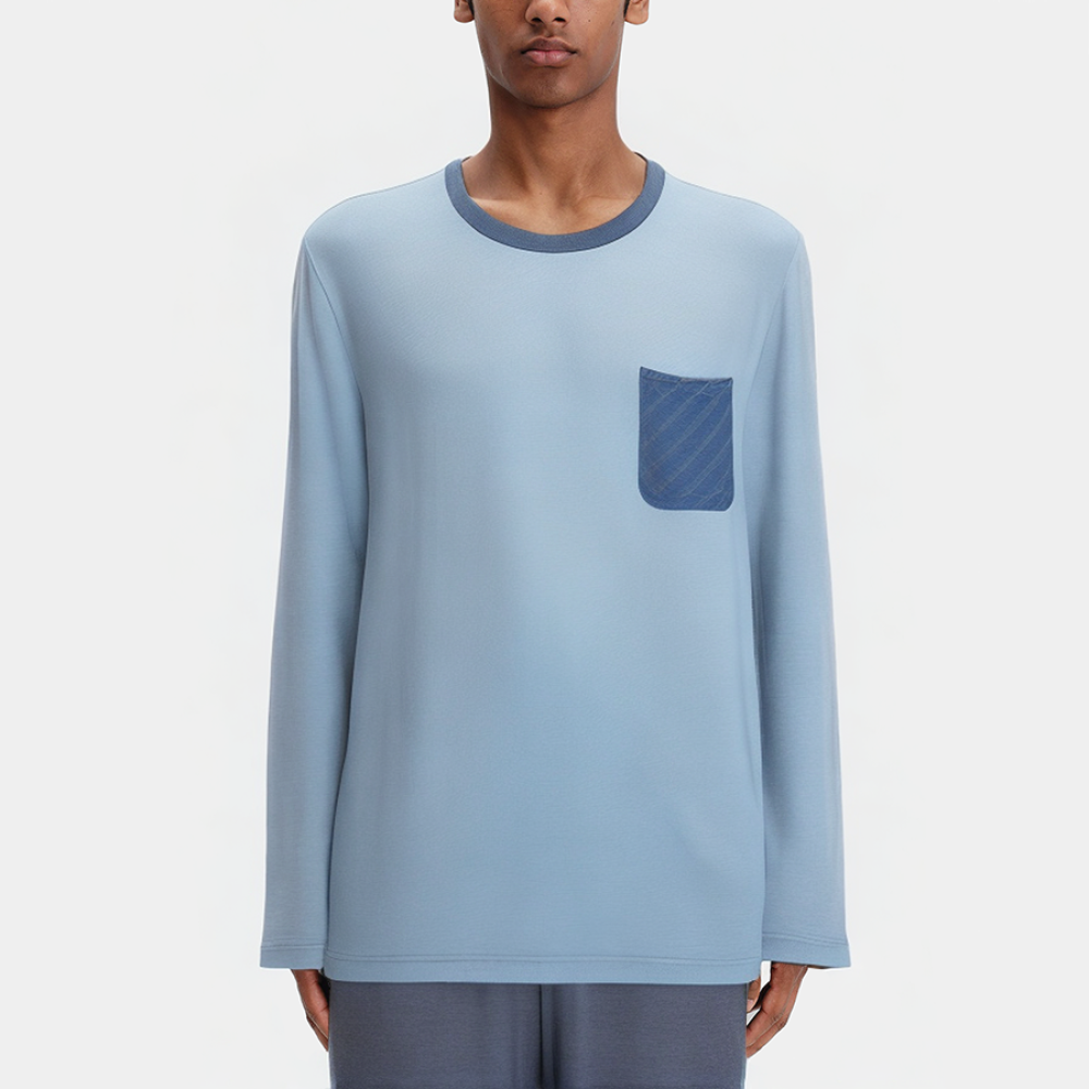 This men's pajama set features contrasting color accents for a stylish and vibrant look. The top features a round neckline and chest pockets for a simple yet practical look. The long sleeves provide warmth and comfort, perfect for lounging around the house or going out. The pants feature an elastic waist and drawstring ties for an adjustable fit. Side pockets provide convenient storage for small items, and the comfortable fit allows for unrestricted movement. The set is soft and breathable, ensuring comfort while you rest.