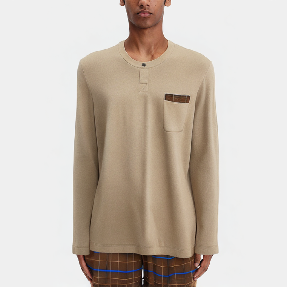 This men's pajama set combines modern style with a vintage feel. The top features a round neckline, long sleeves, and a straight hem for a simple, comfortable fit. A chest pocket adds practicality for storing small items. The pants, printed in a classic plaid pattern, feature an elastic waist with a drawstring for an adjustable fit. Side pockets allow for easy storage, and the straight-leg fit provides a relaxed, natural feel for excellent movement. The set is soft and breathable, perfect for lounging around the house or sleeping.