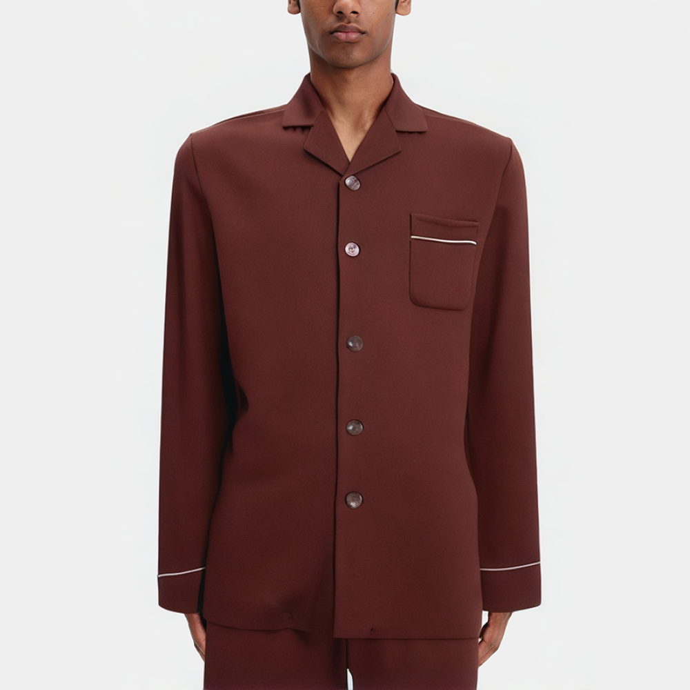 This men's pajama set features contrast piping for added detail and a stylish touch. The top features a lapel, single-breasted buttons, and chest pockets, while the long sleeves provide warmth and comfort for everyday wear. The pants feature an elastic waistband with a drawstring tie and a straight-leg silhouette for a relaxed yet comfortable feel. Side pockets are convenient for storing small items. The overall fit is comfortable and natural, and the soft, smooth fabric makes it perfect for relaxing at home or sleeping, providing a comfortable home experience.
