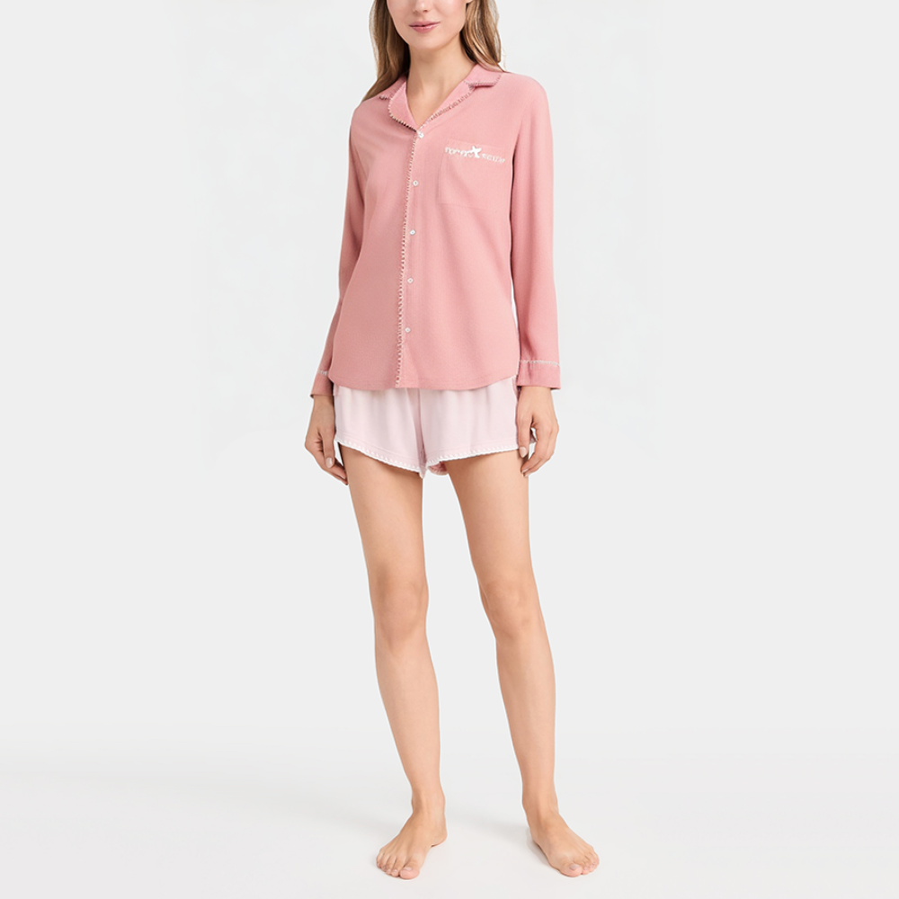 This women's nightgown features unique decorative trims, adding a touch of sophistication and style. The classic lapel and long sleeves provide comfort, warmth, and breathability, perfect for spring and autumn, or for relaxing indoors. The single-breasted placket makes it easy to put on and take off, while the chest pockets offer both practical and decorative storage, providing both storage and added dimension. The streamlined silhouette fits snugly without being constricting, creating clean, elegant lines that enhance comfort and sophistication for lounging at home or sleeping.